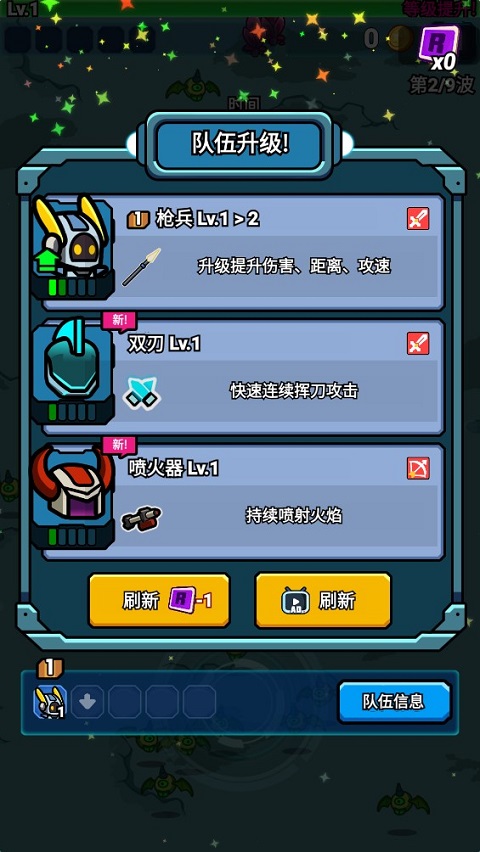 2、消灭怪物可以积累经验值,升级条件满足时可以研发新的机器人或者升级已有的机器人,观察队伍信息,以便做出更好的选择。