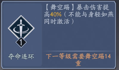 2、舞空踢7级特性让前5下踢(带红色霸体)加40%暴伤!简单暴力,强过其他所有武器的7级特性加的攻击!游戏后期使用舞空踢是100%暴击率的,所以相当于加20%伤害!(因为自带暴伤是200%):
