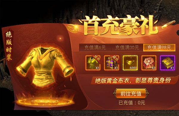 首充可得超值极品武器、技能秘籍、黄金时装,海量元宝等你拿,升级,杀怪快人一步!