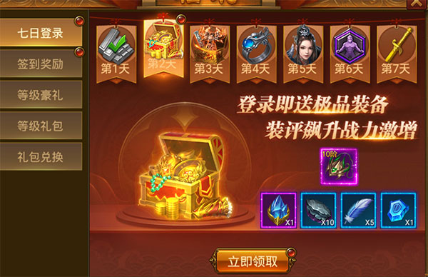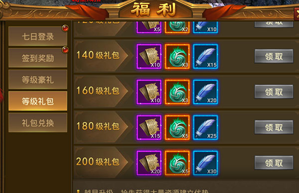 升级到对应等级可领取等级礼包,包含技能书、分身/装备/翅膀升级材料等珍贵物品,升级越高奖励越好!