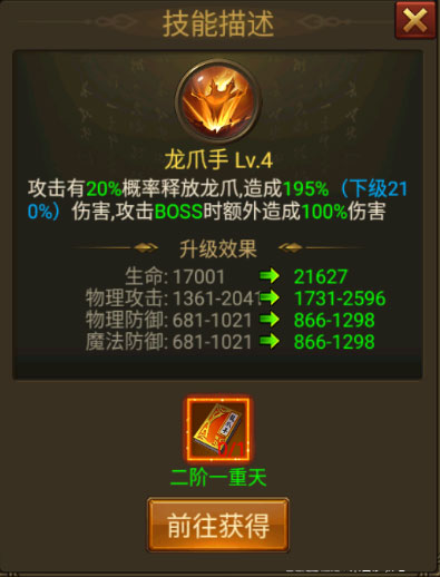 战士技能解析:所有职业技能都是需要升级的,技能升级后可获得更高的输出伤害,技能升级需要对应数量的“技能丹”
