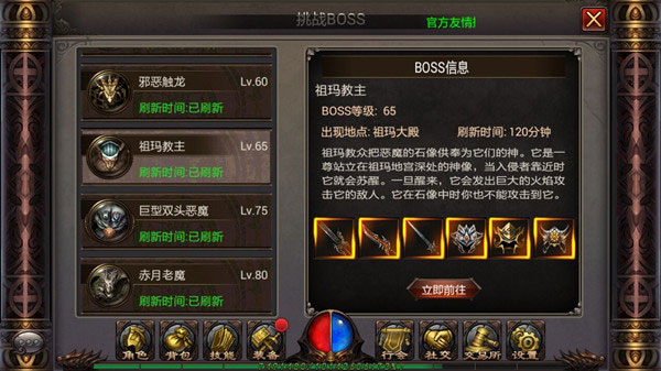 打开世界BOSS图标,找到祖玛教主,就能看到祖玛教主的介绍了,以及还有祖玛教主会掉落的好装备哦,小编也在此祝福大神们好运满满,天天掉橙装。
