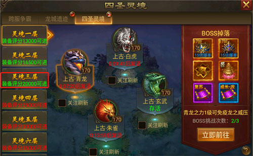 一、BOSS地图BOSS地图是玩家首先能接触到可以PK的地方,分外野外、稀有、活动三种地图的BOSS。在这里玩家可以按照自己的等级战力等要求挑选相应的BOSS进行挑战,当然挑战过程中会有其他玩家抢夺BOSS,需击败玩家抢到归属后方能获取BOSS击杀奖励,当然稀有与活动地图争抢BOSS可向行会其他玩家求助。这里有超多顶级装备材料可以获得,每天必打哦!