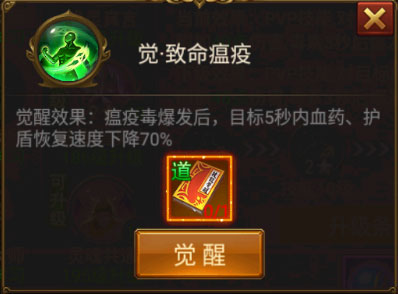 致命瘟疫(主动BUFF类技能,不像法师那样要确定目标。使用后,每次攻击会附加瘟疫毒素伤害,每3秒一次毒素爆发。必须觉醒,觉醒后可抑制敌人回血、回护盾70%速度)