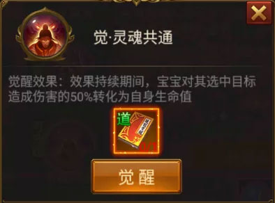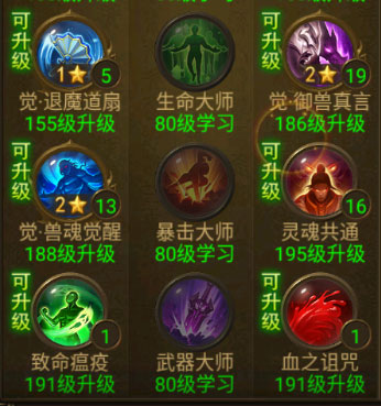主动输出技能:灵魂火符(觉醒后提升20%伤害)、施毒术(觉醒后提升20%伤害)、回旋道扇(觉醒后二段攻击必定暴击,必须觉醒)、退魔道扇(这个技能感觉蛮鸡肋的,无所谓觉醒了)