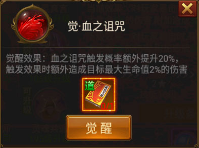 血之诅咒(终极BUFF技能,暴击后30%概率额外造成目标最大生命值5%伤害。必须觉醒,配合回旋道扇技能贼叼。觉醒后50%概率,土豪堆暴击更牛批)