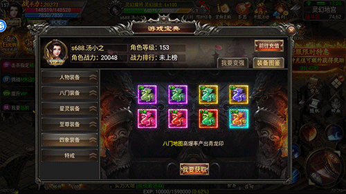 6、装备搞得差不多了就要去搞特戒和四象了这个游戏会在野外爆特戒,但是需要去打官爵地图,这些地图会要求官爵等级,要先去爬屠魔塔才提升官爵等级四象装不是每个地图都掉的、朱雀印就只有转生地图爆率高、玄武印就只有星灵地图爆率高、白虎印就只有官爵地图爆率高、青龙印要去打八门炼妖塔和翅膀地图、拿到四象去升神器里的魔典,后面 VIP 等级都要求这个。
