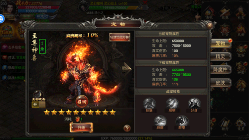 4、达到一定的等级后玩家会获得宠物宝宝,宠物宝宝可以帮助玩家稳定拉高级BOSS,也可以提高玩家击打BOSS的效率,玩家可以给宠物宝宝升级,强化宠物宝宝的伤害,生命,麻痹几率等。