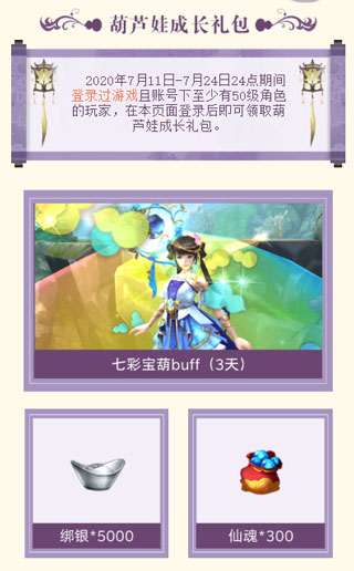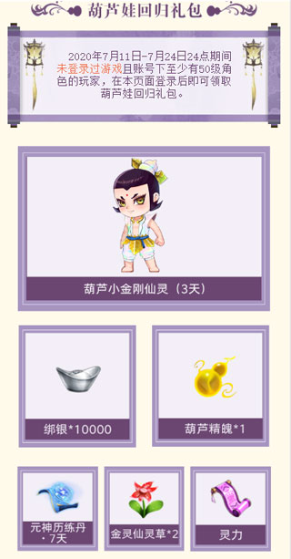 3、满足活跃玩家条件的玩家可以直接登录页面领取葫芦娃成长礼包。