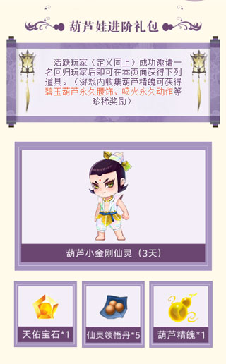 2、本次可领取的礼包分为四种,分别是【葫芦娃成长礼包】、【葫芦娃进阶礼包】、【葫芦娃回归礼包】、【葫芦娃萌芽礼包】