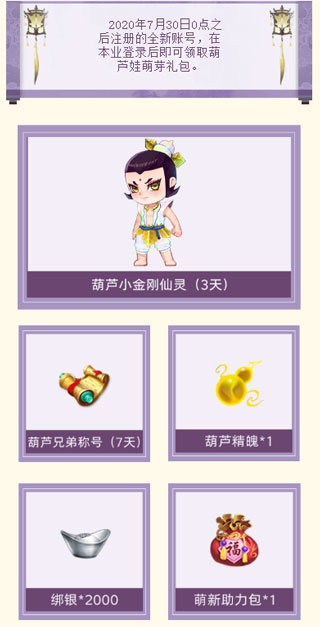 6、满足条件的新玩家可以直接领取葫芦娃萌芽礼包
