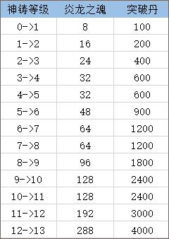 神铸每级所需物品列表: