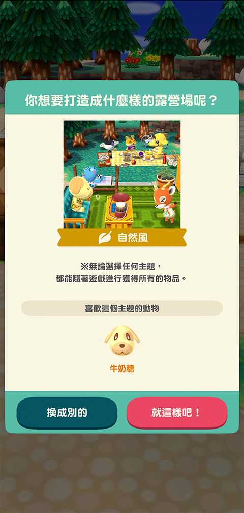 7、我们的任务是选择打造一个什么样风格的露营场地,有自然风、奇幻、运动风、酷感这四种风格,我们这里选择自然风;