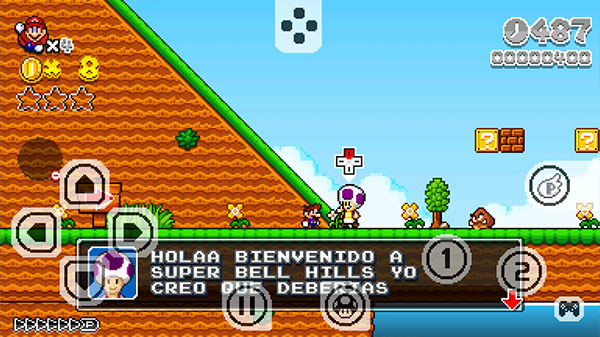 3、移动马里奥,底部有暂停按钮,可以随时暂停画面,1是拾取,2是跳跃;