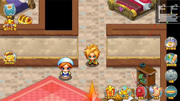 1、首页左上角可以“保存”可以存档游戏进度,点击地板,就可以操纵角色移动到指定位置,右下角点开,可以看到设置等菜单键。