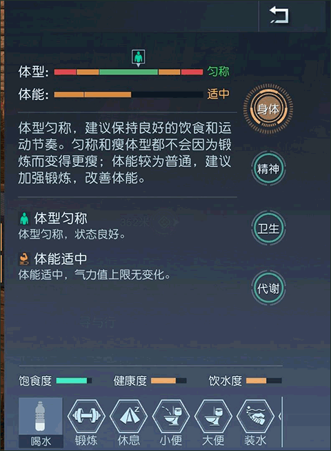 作为一款与现实生活贴合度很高的生存游戏,黎明觉醒存在很多拟人化的设定,比如在游戏中一直食用高热量的食物会导致身体肥胖,进而降低移动速度,这时需要进行体能训练来杜绝这一现象,可以找专门的器械进行锻炼,也可以在野外打开生存仪原地锻炼,锻炼一次之后会进入一小时的肌肉疲劳状态,在此期间,无法通过锻炼进行指标改善。生存仪中还有很多指标,精神记录精力和理智,精力过低影响角色的采集速度,理智过低会产生幻觉,这两项可以通过深度睡眠而提升。卫生包含两项指标皮肤和衣物,这两项指标过低会导致被怪物攻击次数增加,可以通过在干净的水源洗脸洗衣来改善。