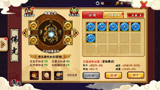 佛光方面可以选择平民皆为适用的降魔佛光。功德依旧是4减伤。最好是极品四级的,不过一般三级有减伤就好。实在没有减伤也可以考虑冷却,但作用不是特别大。还有极其不推荐吸血佛光,即使有四个极品吸血前期也就只能吸几滴血,几乎没用。所以吸血为不可选功德。正常搭配如下,仅供参考: