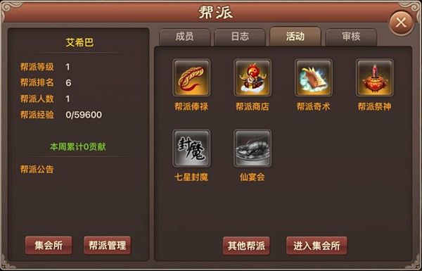 帮派4级后开放,所有成员每天1次封魔机会,集齐7人后全部7人获得350声望,200贡献
