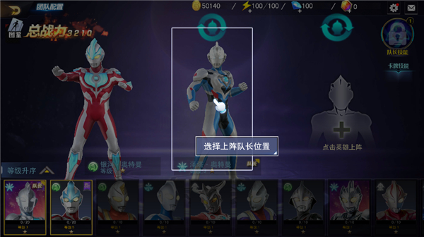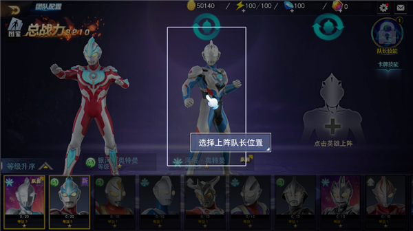 13、玩家可以自由选择阵容队长,如点击银河奥特曼,点击上阵,选择上阵队长位置即可;