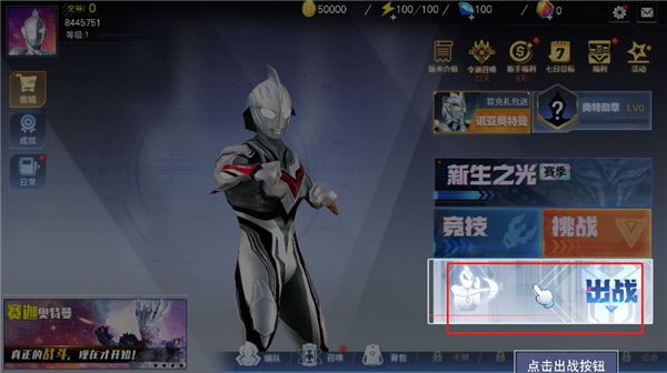 1、进入游戏,点击出战;