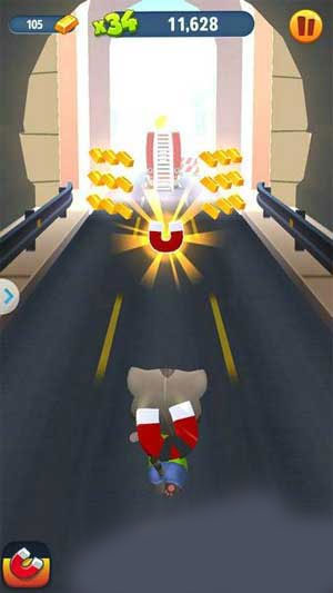 怎样才能在短时间内收集到更多金条很简单,用“磁铁”这个道具可以把界面中所有金条“吸”过来,因此,只要当前行进路线上不出现大型障碍物,玩家无需变道也能收集到很多金条。不过,磁铁与头盔一样,都只能在限定时间内发挥作用,玩家可以通过升级角色的“磁铁持续时间”属性,获得更长久的“吸金”效果。