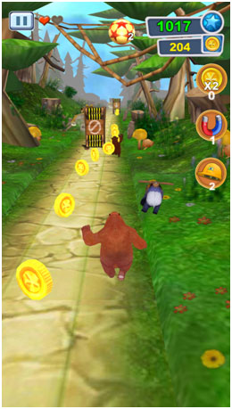 3、就像我们前面介绍说到的,你的目标是尽可能帮助熊大跑得更远,同时还尽可能的收集道路上的金币,游戏的视觉是面向角色前方前进的。