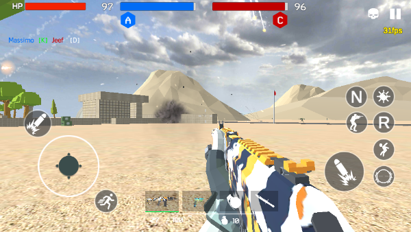 6、部署完之后开始正式进入游戏战斗,游戏界面的由轮盘控制方向行走,同时有两个子弹按钮,可对准敌人后进行射击