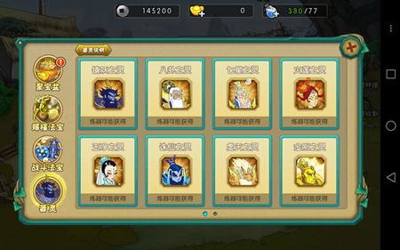 炼器符:法宝2星后娃娃附身可使用,随机增加1点法宝经验或者2-3点不等的附身加成属性(需激活法宝星级)。随着法宝器灵的开启,使用炼器符炼器进度满或者炼器中途可以几率召唤器灵,它的作用也越来越大,