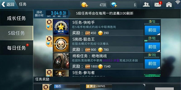5、游戏的任务系统,任务系统有每日任务,可以获得大量的金币奖励以及经验奖励,更亮眼的是S级任务,每个任务有五钻石的奖励!S级任务会在每周的周一凌晨三点更新,小伙伴们别忘了每周做完S级任务领取钻石奖励哦!