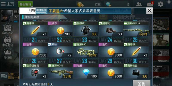 3、新手登录七天是有很多黄金大枪送哒!是不是可以很好的体验游戏了?登录第二天还有50钻石哦!虽然钻石不多,但是蚊子肉也是肉啊!你说是不?