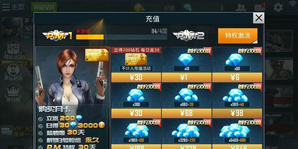 7、在这里我还是要说一下月卡的,有条件的悠悠建议购买了吧!本人明天也要买,想买点东西呢!月卡真是个好东西,购买后直接返还200钻石,然后每天还能领取30钻石,持续30天!也就是300钻石,花30元买了500钻石,不是很划算吗?购买月卡还有游戏女 角色“蓝碧姬”送!虽然也是30天的,不过送的不要白不要不是吗?再有就是永久解锁3号背包!背包数是个好东西,不然活动送的枪放在仓库都不能用,放着过期了很可惜不是吗!购买月卡还能激活PM特权一个月!也就是游戏的会员!