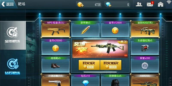 6、游戏内的抽奖系统!萝卜可先提醒啊! 平民玩家可不要抽钻石的!我在这里说抽奖系统是为了金币抽奖里面的十钻石!大家都知道,游戏现在还未完善,很多枪支还没出来,所以金币买了所需的金币枪之后就没什么作用了!那你就错了!来抽金币抽奖吧!帅的人都抽到了十钻石了!你还在等什么?就算没有抽到钻石,抽个防弹衣也是杠杠的不是么?搞不好抽到黄金的永久枪不是乐了?哈哈!