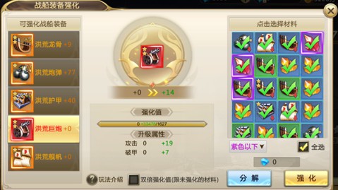 战船装备品质越高,星级越多,属性加成越多。战船装备可进行强化操作。