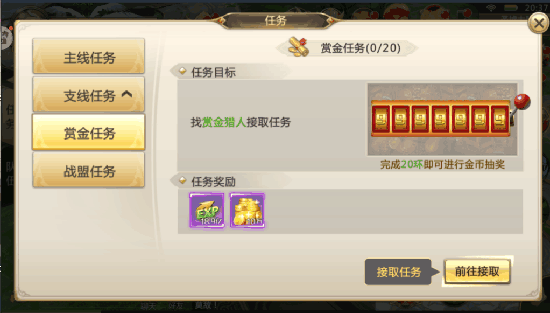 赏金任务是每日任务的一种,一共有20环。玩家可以在主界面左侧任务消息里点击【赏金任务】,完成对应任务后就可以获得大量经验和金币。
