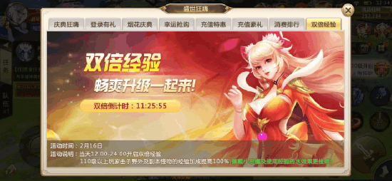 因为游戏里会不定期开放双倍经验活动(一般在中午12点之后开始),活动期间玩家打经验副本或者刷怪都会获得双倍经验。