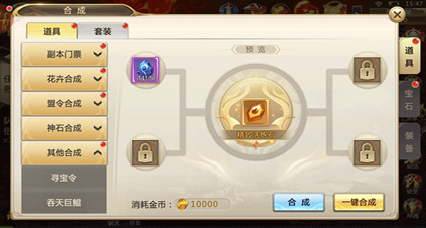 新手重点注意:洗练石别乱用!因为我也是从新手过来的,那时候等级达不到要求不知道,后来才知道到至尊一级50洗练石可以合成一个黄色洗练石,三个黄色洗练石可以合成一个红色洗练石,那时候我不知道还有这个功能所以洗练石都浪费了,所以现在作为老手玩家我建议大家把洗练石存起来,到至尊一级就可以合成了,因为红色洗练石在活动中充值或者抽奖获得是比较难的。
