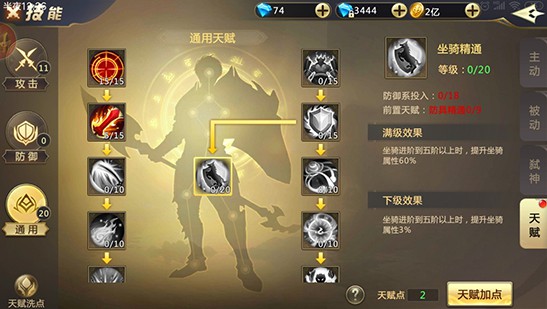天赋技能分为攻击,防御和通用。玩家每升一级会增加一点天赋点。用来学习天赋技能。目前有三种大流派的加点方式。