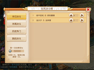 玩家可以在御林军统领处查看生死决斗榜,决斗榜包含“本日决斗”、“本周决斗”、“历史热门”、“我的决斗”,玩家可以查看决斗录像,对自己喜欢的决斗点赞。
