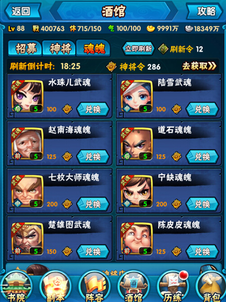 酒馆中,我们可以利用手里的神将令来兑换心仪的武将,通过神将令兑换的武将都是金卡哦~神将令可通过剧情副本和炼化炉获得。