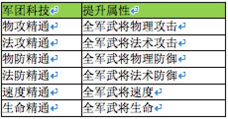 1.个人军团科技种类总共有6种,分别给自己所有的武将添加基础属性(物攻、法攻、物防、法防、速度、生命);