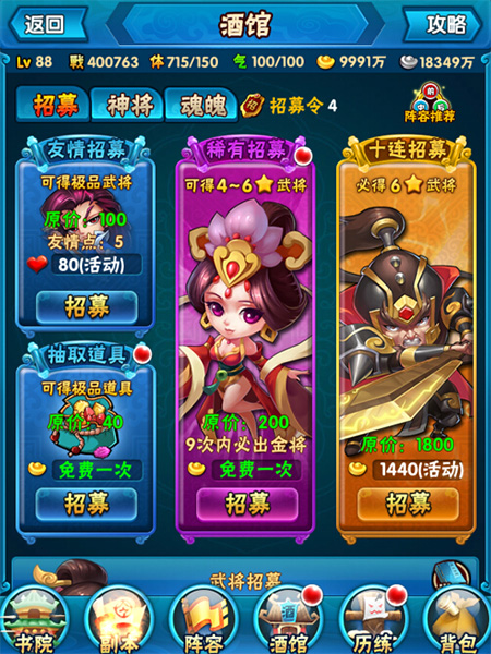 友情点招募也可获得武将;友情点需要好友之间互相赠送获得,所以小伙伴们要记得多加好友哦~