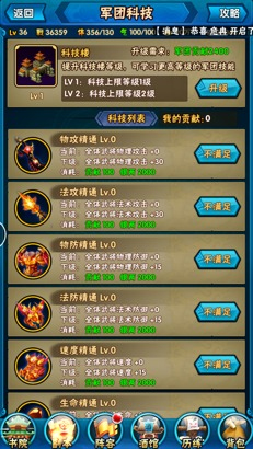 3.消耗军团贡献和银币可以升级科技,军团令、银币不足或科技等级达到本军团上限时,该军团科技无法进行继续升级;