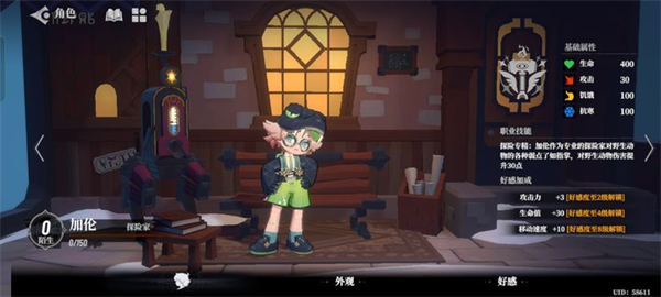 探险家,外号鳄鱼,技能是砍动物加伤害,动物会掉兽皮和兽肉,加仑可以通过打动物加快发育,推荐度A。