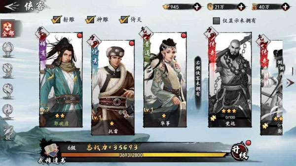我们再来说一下游戏中的侠客招募方法,分别有普通招募以及高级招募,其中高级招募要用到佳酿,我们可以使用元宝来购买佳酿,而通过高级招募的话我们是可以必得3星以上的侠客角色,同时值得一提的是,每天还有半价优惠,小伙伴们可以将每天的半价优惠都用掉,就算没抽到5星侠客,不过这样也可以攒招募保底次数,等这个次数到一定的时候就可以必得5星侠客角色了。