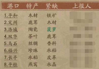 每个港口的货物价格是不一样的,且需要有人上报才会显示,因此需要商会会长和成员们沟通好,优先安排成员到各个港口将货物信息上报日志,便于成员了解不同港口的特产和紧缺货物,并进行贸易。(PS:绿色代表持有货物)
