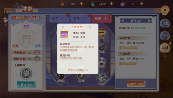 3、点亮人格就可以激活该加成属性,点亮等级越高,加成越多。点亮人格需要人格源力与人格点,人格点可以通过升级获得,等级达到天命后每升一级获得一点人格,人格源力可以通过铜钱副本和挂机获得,也可通过商城直接购买。
