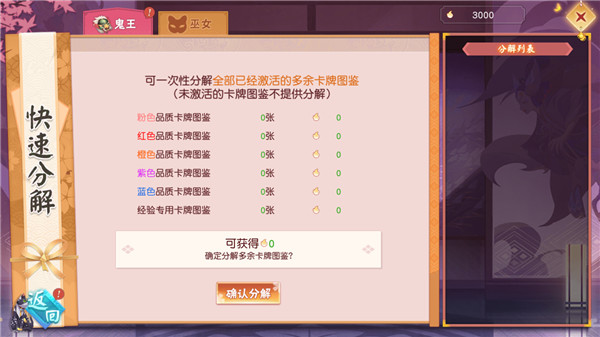 3、在参与上述玩法时 ,除了产出图鉴激活道具之外,有时候也会产出多余的、已经激活了的图鉴道具和经验专用卡牌图鉴。忍者大大们可以再分解界面将它们分解。分解后获得道具可以用以升级已经激活的图鉴。