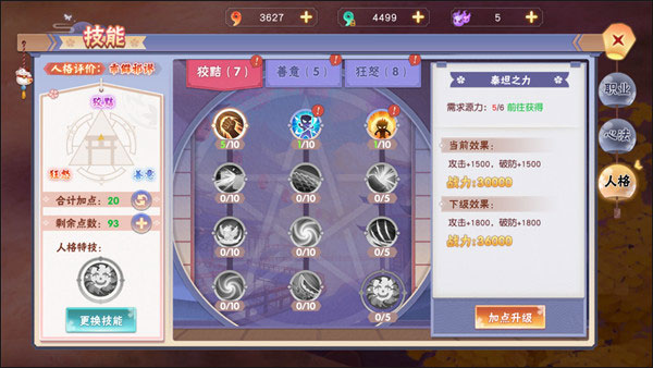 2、要开启人格系统首先需要达到天命5级,承袭天命,才能设定独特的人格。人格技能分为三个分支:狡黠、善意、狂怒,每一个分支的侧重点都不一样,同时三个分支加点到一定的点数还能获得一个终极大招。