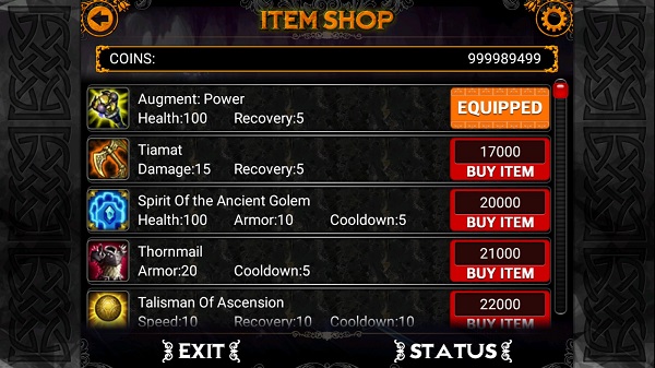 购买各种装备,每种装备效果和属性都不同,增加属性可以提高过关的几率,降低难度。