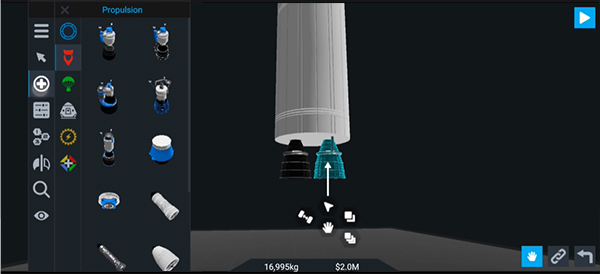 2、 检查火箭部件的缺陷并添加对称部件,对称模式可用于连接到燃料箱侧面的部件,它会在燃料箱的周围动态地创建克隆的部分。